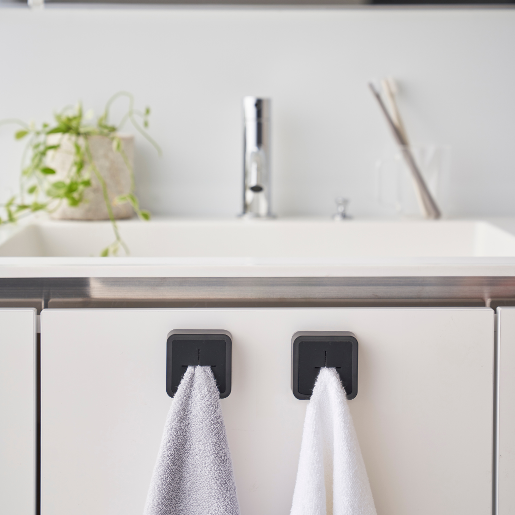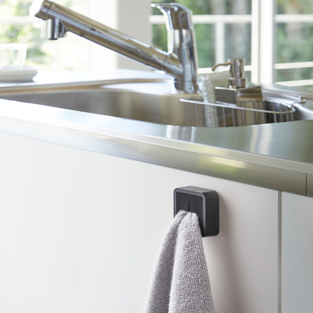 Der Klebehaken-Handtuchhalter Schwarz von Yamazaki kombiniert minimalistisches Design mit maximaler Funktionalität. Mit nur einem Fingerdruck lässt sich ein Handtuch oder Geschirrtuch sicher fixieren und ebenso leicht wieder entnehmen – eine elegante Lösung für moderne Haushalte.
